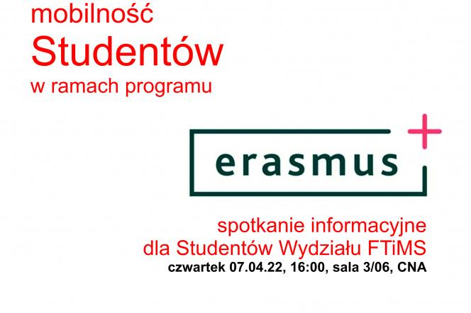 informujemy, że w czwartek (07.04.2022 r.) o godzinie 16:00 w sali 3/06 w Centrum Nanotechnologii A, odbędzie się spotkanie informacyjne dla studentów Wydziału FTiMS na temat mobilności studentów w ramach programu Erasmus+.