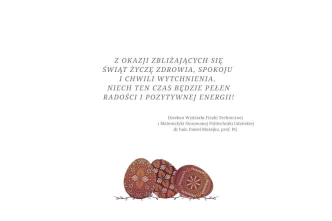 W imieniu Kolegium Dziekańskiego, Dziekan WFTiMS dr hab. Paweł Możejko, prof. PG, składa Państwu życzenia zdrowia, spokoju i chwili wytchnienia oraz by ten czas był pełen radości i pozytywnej energii.