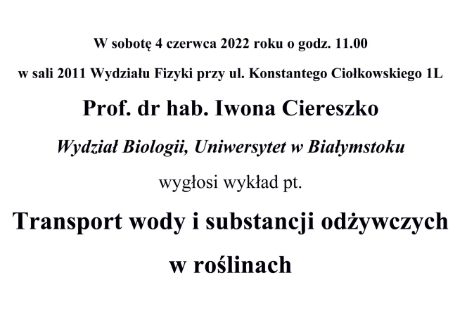 Oddział Białostocki Polskiego Towarzystwa Fizycznego oraz Wydział Fizyki zapraszają do wzięcia udziału w wykładzie prof. dr hab. Iwony Ciereszko pt. "Transport wody i substancji odżywczych w roślinach ".