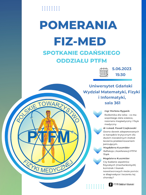 Serdecznie zapraszamy na kolejne spotkanie członków i sympatyków gdańskiego oddziału PTFM z cyklu POMERANIA FIZ-MED. Spotkanie odbędzie się w dniu 5 czerwca br. o godzinie 15:30 w budynku Wydziału Matematyki, Fizyki i Informatyki Uniwersytetu Gdańskiego, sala 361.